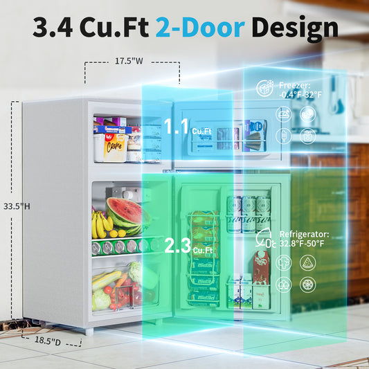 3.4 Cu.Ft Small Refrigerator with Freezer, Mini Fridge with Freezer, 7 Settings Temperature Adjustable, Double Door, Compact Refrigerator for Bedroom, Dorm and Office, White