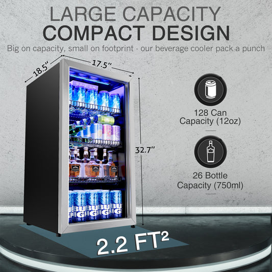 3.2 Cu.Ft Beverage Fridge, Mini Fridge With Glass Door, Beverage Cooler Refrigerator, Wine Drink Beer Fridge, Adjustable Shelves & Digital Temperature Display, 26 Bottle 128 Can