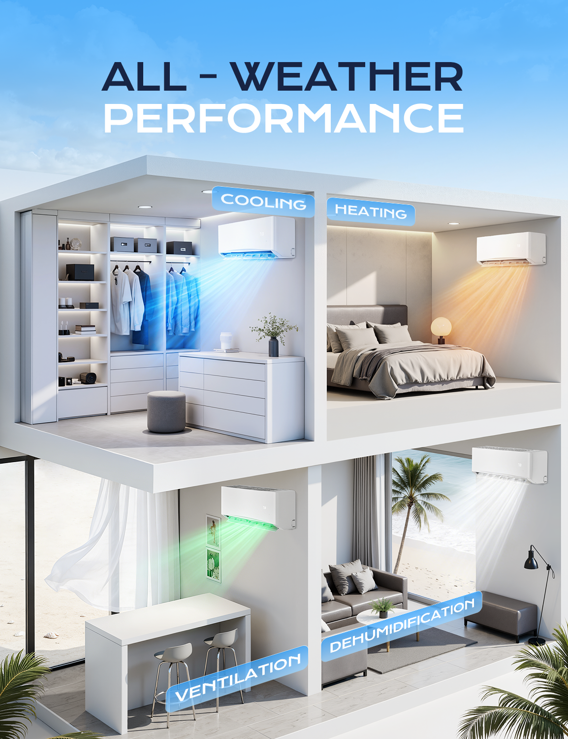 - ๐๐จ๐ฐ๐๐ซ๐๐ฎ๐ฅ ๐๐๐๐ซ-๐๐จ๐ฎ๐ง๐ ๐๐ฅ๐ข๐ฆ๐๐ญ๐ ๐๐จ๐ง๐ญ๐ซ๐จ๐ฅ:This 12000 BTU mini-split system delivers fast and efficient cooling or heating for spaces up to 750 Sq.Ft. Equipped with intelligent defrost technology, it actively preserves internal components and ensures long-term durability. The outdoor unit maintains reliable performance even in extreme low temperatures down to -4ยฐF